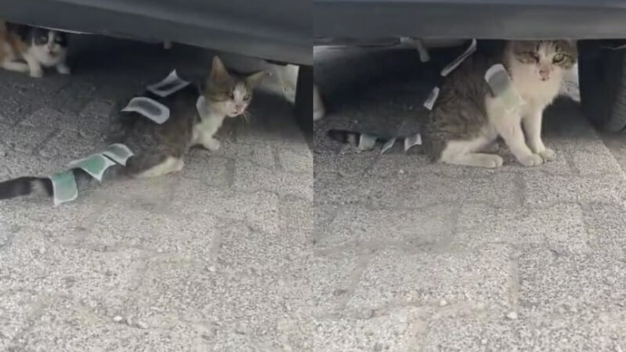 Üsküdar’da bir sokak kedisinin vücudunun çeşitli yerlerine ağda bantları yapıştırıldığı görüldü. Kedinin kuyruğundan sırtına kadar farklı noktalara yapıştırılan ağda bantlarını gören vatandaşlar şaşkınlık yaşadı. Vücuduna ağda bantları yapıştırılan kediyi gören bir vatandaş cep telefonu kamerası ile kediyi kayda aldı.