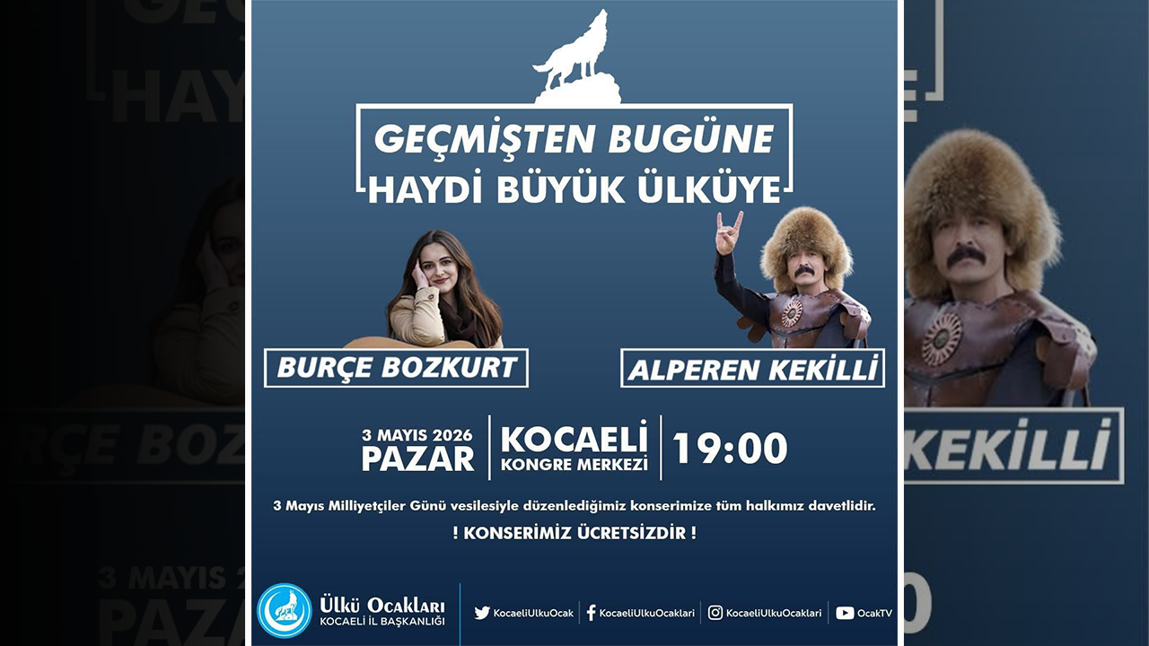 Ülkü Ocakları Kocaeli İl Başkanlığı tarafından 3 Mayıs Milliyetçiler Günü kapsamında özel bir konser düzenleniyor. Etkinlikte Burçe Bozkurt ve Alperen Kekilli sahne alacak.