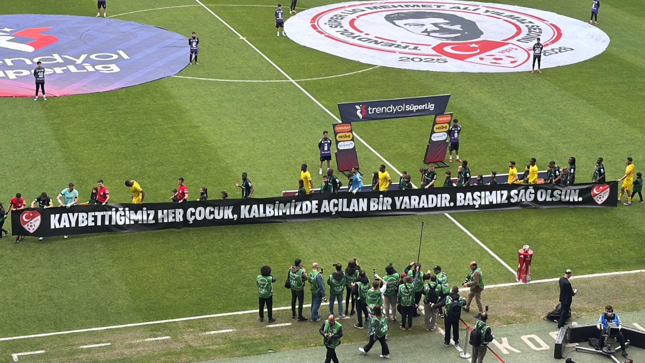 Futbolcuların ellerinde “ KAYBETTİĞİMİZ HER ÇOCUK, KALBİMİZDE AÇILAN BİR YARADIR.BAŞIMIZ SAĞOLSUN” yazılı pankart yer alırken, tribünlerde de duygusal anlar yaşandı.