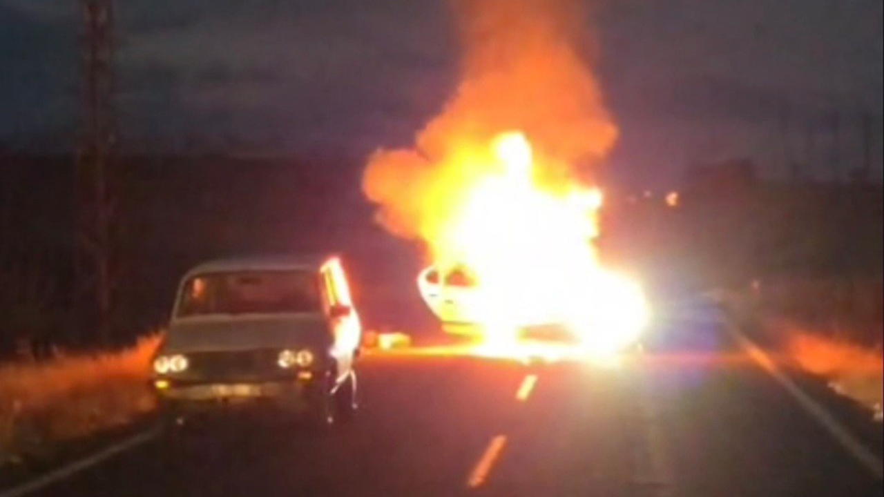 Şanlıurfa’nın Hilvan ilçesinde meydana gelen trafik kazasının ardından alev alan otomobilde art arda patlamalar yaşandı. Korku dolu anlar çevredeki vatandaşlar tarafından cep telefonuyla kaydedildi.