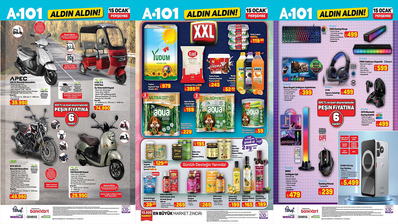 Yurdun dört bir yanında şubesi bulunan A101 marketin katalogları yenilendi. Her hafta perşembe günlerine özel hazırlanan A101 kataloglarına bir yenisi daha eklendi. 15 Ocak Perşembe günü A101 şubelerine hangi ürünlerin geleceğini merak eden vatandaşlara yeni ürünler duyuruldu. Gelecek hafta A101'de Volta VM5 Neo Üç Tekerlekli Moped 74.990 TL'den, Kiwi Fondü Makinesi 799 TL'den, Kiwi Kahve Köpürtücü 219 TL'den satılacak. Peki, A101'e hangi ürünler gelecek? İşte merak edilen A101 15 Ocak 2026 aktüel ürünler kataloğu..